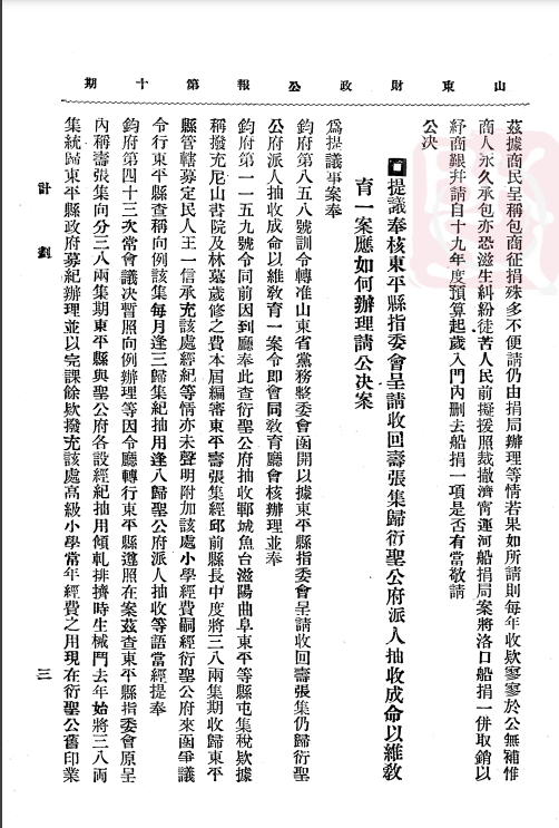 《计划:提议奉核东平县指委会呈请收回寿张集归衍圣公府派人抽收成命以维教育一案应如何办理请公决案》