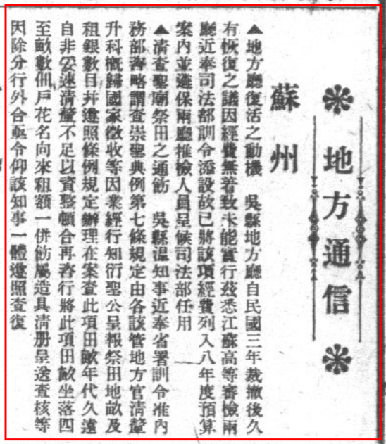 [T]《地方厅复活之动机吴县地方厅自民国三年裁撤后久 有恢复之议因经费无著致未□实行兹悉江苏高等审检两……》