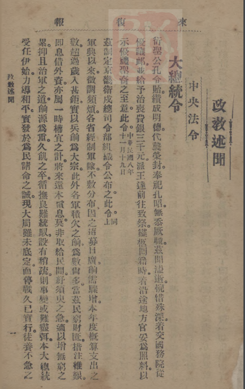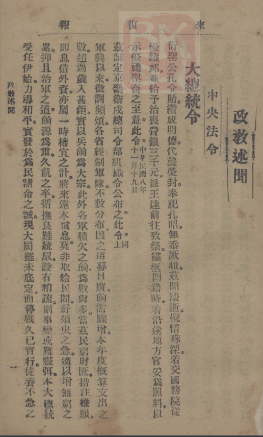 《政教述闻:中央法令:大总统令(中华民国八年十一月十九日):衍圣公孔令贻……》
