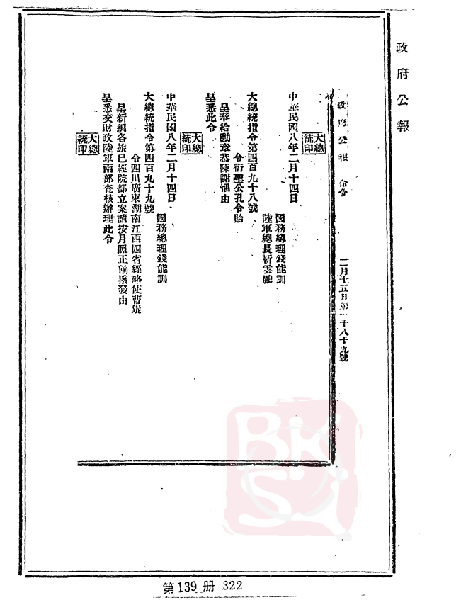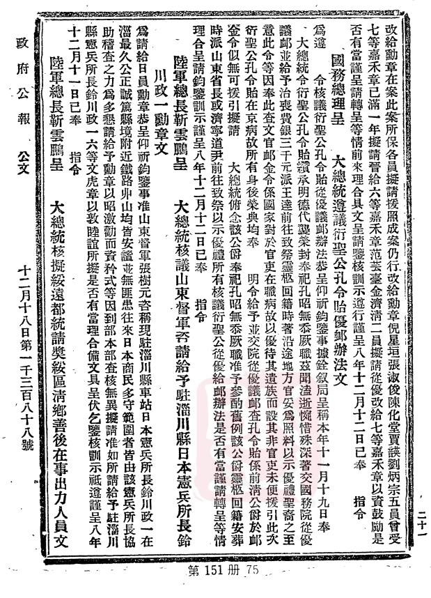 錢能訓:《大总统令:大总统指令第四百九址八号(中华民国八年二月十四日):令衍圣公孔令贻:呈奉给勋章恭陈谢悃由》